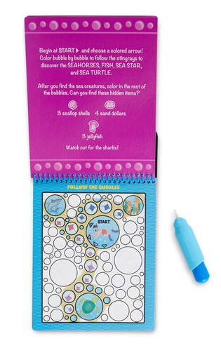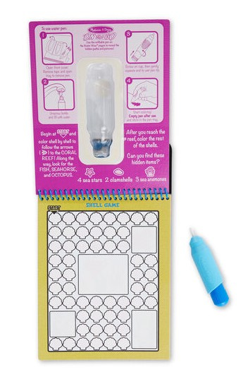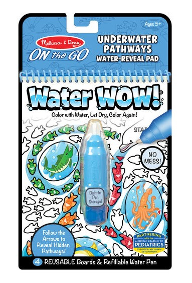 Mėgsti piešti, tačiau taip nuobodu papiešus tvarkytis darbo vietą? Atrask piešimo vandeniu knygą MELISSA & DOUG Water Wow Po vandeniu ir daugiau jokios netvarkos! Joje rasi vandeniu pripildomą rašiklį ir keturis lapus su piešiniais: nardymo, kriauklyčių žaidimo, jūros, žuvų. Sek labirintais rodyklių rodoma kryptimi ir jos tave nuves ten, kur patirsi linksmų nuotykių bei galėsi juos pripildyti spalvomis. Pamatysi, kaip vos brūkštelėjus rašikliu, atsiranda įvairūs takeliai, labirintai, spalvos. Palauk, kol lapai išdžius, ir piešiniai pranyks, gali juos spalvinti vėl ir vėl. Kiekviename knygelės lape taip pat reikės surasti paslėptus dalykus bei atlikti skaičiavimo užduotėles. Stambus rašiklis ne tik patogus vaiko rankytei, bet ir yra laikomas priekiniame knygelės viršelyje, o jos lapai susegti spirale, todėl knygelė itin tinka keliaujant. Piešimo vandeniu knyga padeda lavinti vaikų motorikos įgūdžius, gebėjimą vizualiai skirti. Tai puiki maža dovanėlė 5-7 metų priešmokyklinukui, skirta leisti laiką atokiau nuo ekranų. Tinka vaikams nuo trejų metų. Naudoti prižiūrint suaugusiesiems. Rinkinį sudaro 4 spirale susegti lapai ir vandeniu pripildomas rašiklis.