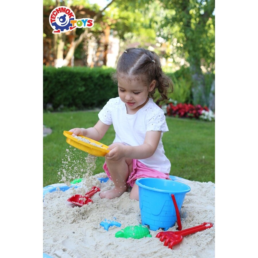 Smėlio rinkinys, kurį sudaro: ryškus kibirėlis, kurio dėka galima statyti smėlio pilis, sietelis, kastuvas, grėblys, 2 formelės.