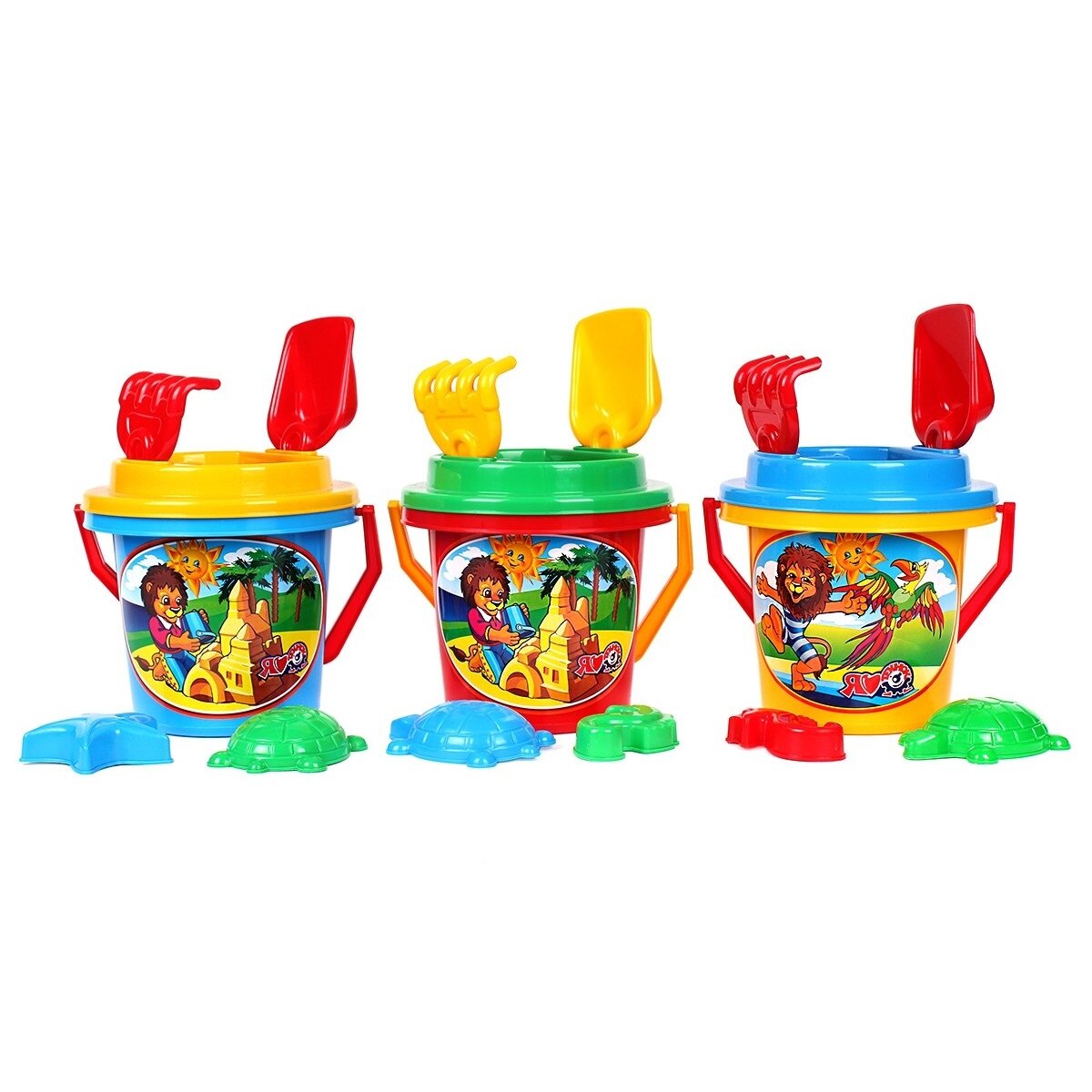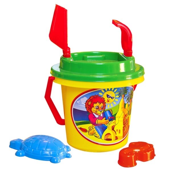 Į šį rinkinį įeina ryškus kibiras su paveikslėliu ir patogia rankena, kastuvas, grėblys, 2 formelės ir sietelis.
