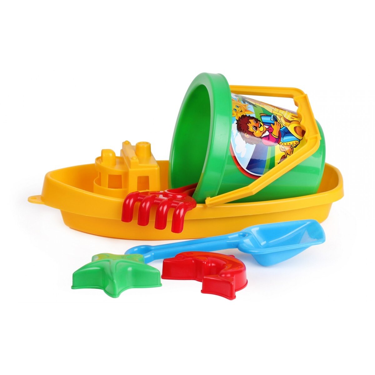 Smėlio rinkinys su kibiru, valtimi, kastuvu, grėbliu ir 2 formomis smėliui.
