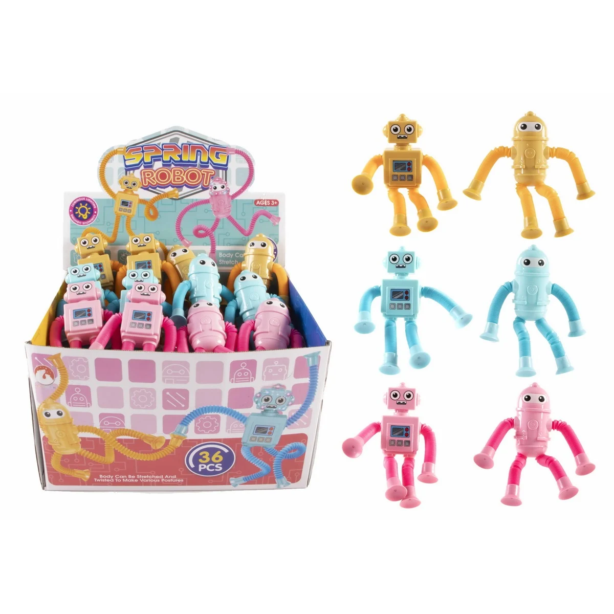 Šis roboto žaislas su apačioje esančiu siurbtuku yra puikus pasirinkimas vaikams. Dėl siurbtuko jis lengvai pritvirtinamas prie lygių paviršių, tokių kaip veidrodžiai, langai ir plytelės. Vaikai gali mėgautis žaisdami su juo bet kurioje vietoje ir stebėti, kaip jis lenkiasi ir sukasi įvairiomis kryptimis.
