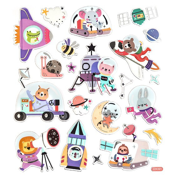 Plastikiniai lipdukai – kosminiai gyvūnai su sidabro akcentais.