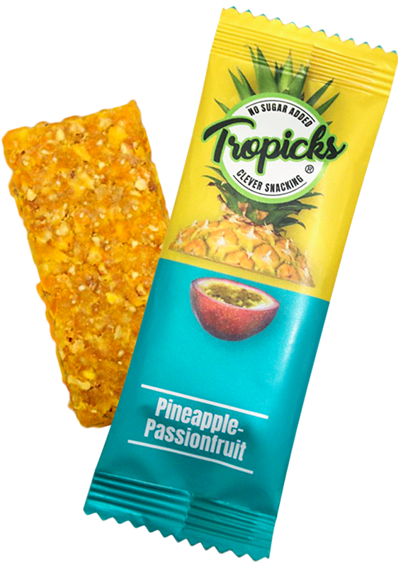 Natūralus džiovintų ananasų ir pasiflorų batonėlis be cukraus TROPICKS, 20 g