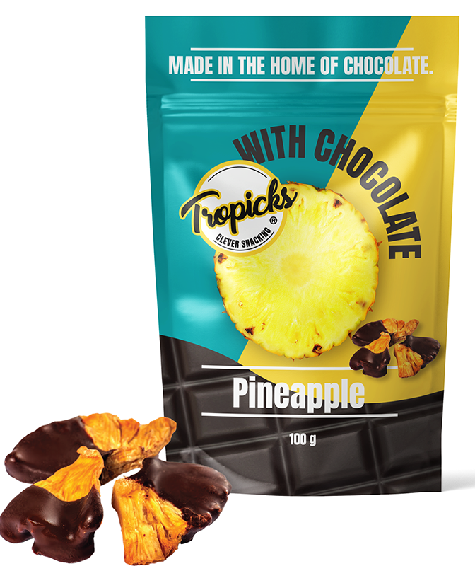 Natūralūs džiovinti ananasai su juoduoju šokoladu TROPICKS, 100 g