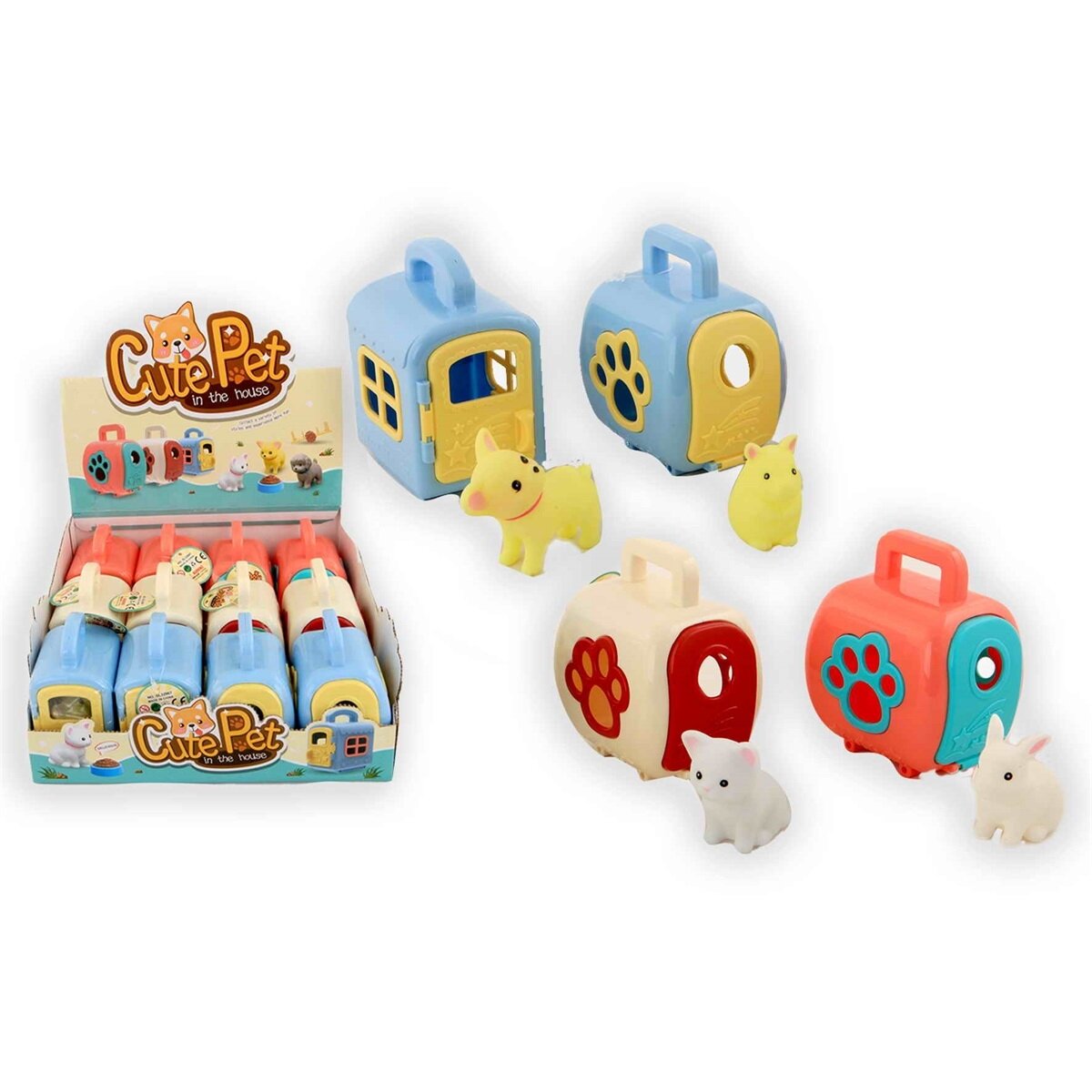 3 rūšių gyvūnai. Kartu pridėti ir priedai (lėkštutė, dubenėlis ir kt.)