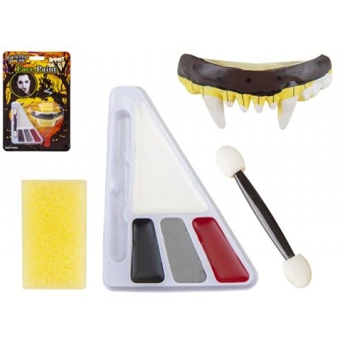 Rinkinyje yra: dažai 4 spalvos; kempinėlė; teptukas; netikri dantys.