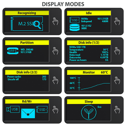 - External USB-C 10Gbps metal box with info display for M.2 NVMe and SATA SSD