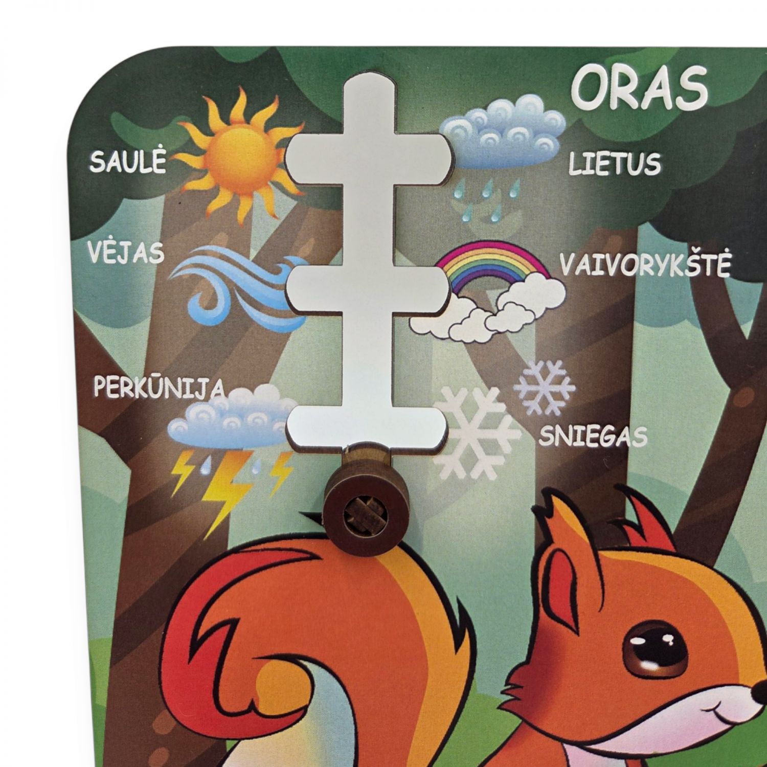 Ryškioje, miško motyvais dekoruotoje lentelėje su žaismingais gyvūnėliais vaikas ras judančias dalis, kuriomis galės nustatyti: