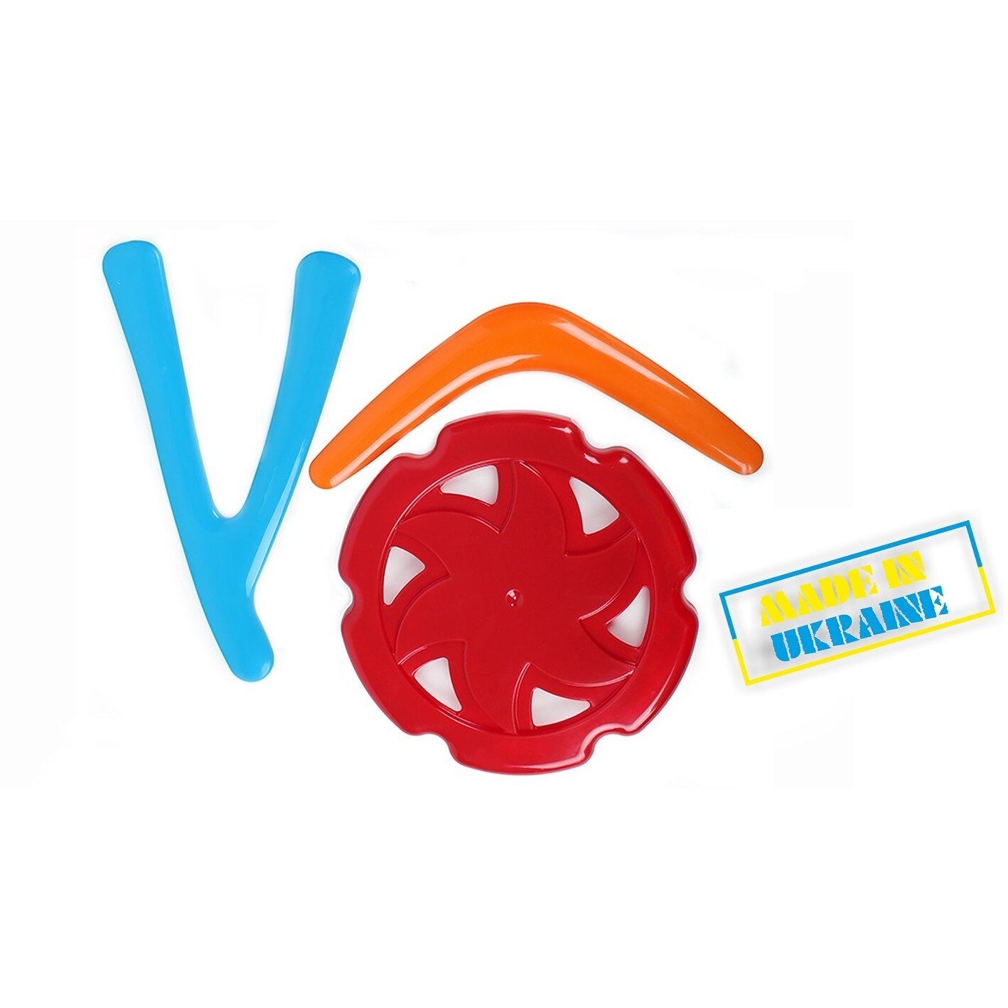Trijų skraidančių figūrėlių rinkinys – „modernaus“ stiliaus skraidantis diskas ir du bumerangai – klasikinis ir modernus. Turėsite puikią galimybę žaisti įvairius frisbiui rekomenduojamus žaidimus – „Freestyle“, „Dog-frisbis“, „Disk-golf“, o bumerangai suteiks galimybę pasijusti tikru profesionalu. Ypač tai įdomu šeimos veiklai lauke.
