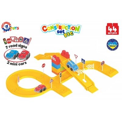 Rinkinyje rasite 44 skirtingus elementus, tokius kaip takai su sankryžomis ir posūkiais, nusileidimai, kelio ženklai ir automobiliai. Konstrukciniai elementai yra dideli ir patogūs mažiems vaikams. Galite statyti įvairias figūras: garažus, automobilių stovėjimo aikšteles, namus, laivus ar gyvūnų figūrėles.