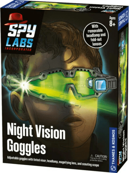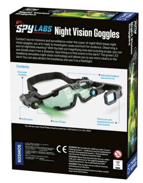 Tyrimą turite vykdyti tamsoje? Tad jums prireiks šių Spy Labs naktinio matymo akinių! Jie padės jums tirti bylas ir ieškoti įrodymų net ten, kur nepatenka dienos šviesa. Su išskleidžiamu didinamuoju lęšiu galėsite įžiūrėti detales net per atstumą. Žaliasis LED žibintas imituoja naktinio matymo technologiją ir leidžia aiškiau matyti tamsoje! Taip pat galite atjungti priekinį žibintą ir naudoti jį kaip žibintuvėlį.