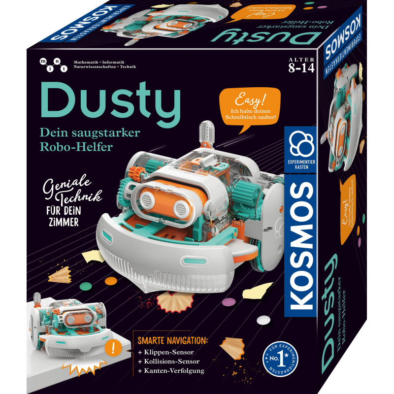Įkraunamas baterijomis, Dusty pašalina purvo daleles nuo stalo stalviršio kaip ir jo „didieji“ modeliai, o išradingi mechaniniai jutikliai neleidžia jam užstrigti ar nukristi. Tačiau Dusty yra ne tik išmanus, bet ir simpatiškas, jis rodo savo charakterį su besikeičiančiomis veido išraiškomis. Dėl permatomų dalių galite įsigilinti į jo mechaniką. Šis KOSMOS eksperimentų rinkinys yra labai smagus ir praktiškas!