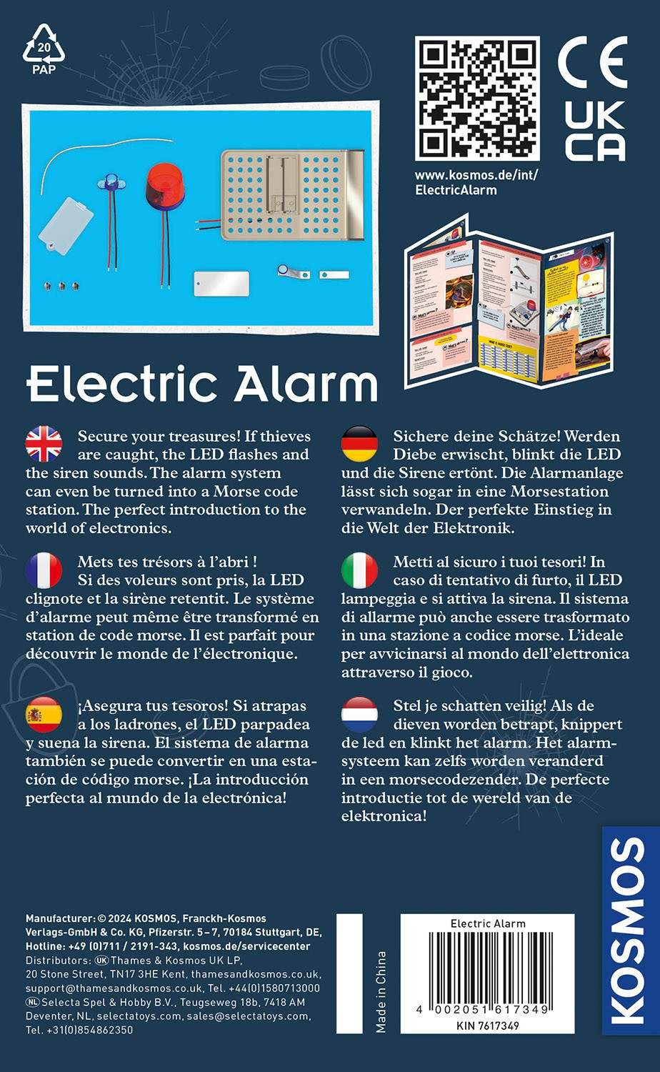 Nedideli eksperimentai ir įdomi papildoma informacija paaiškina, kaip veikia elektros grandinės ir kas slypi už Morzės abėcėlės. Iliustruotos instrukcijos skatina tyrinėti elektroniką ir eksperimentuoti su signalizacijos sistema. Padovanokite KOSMOS eksperimentų rinkinį kaip gimtadienio dovaną ar suvenyrą ir turėkite smagumo bei žinių viename.“