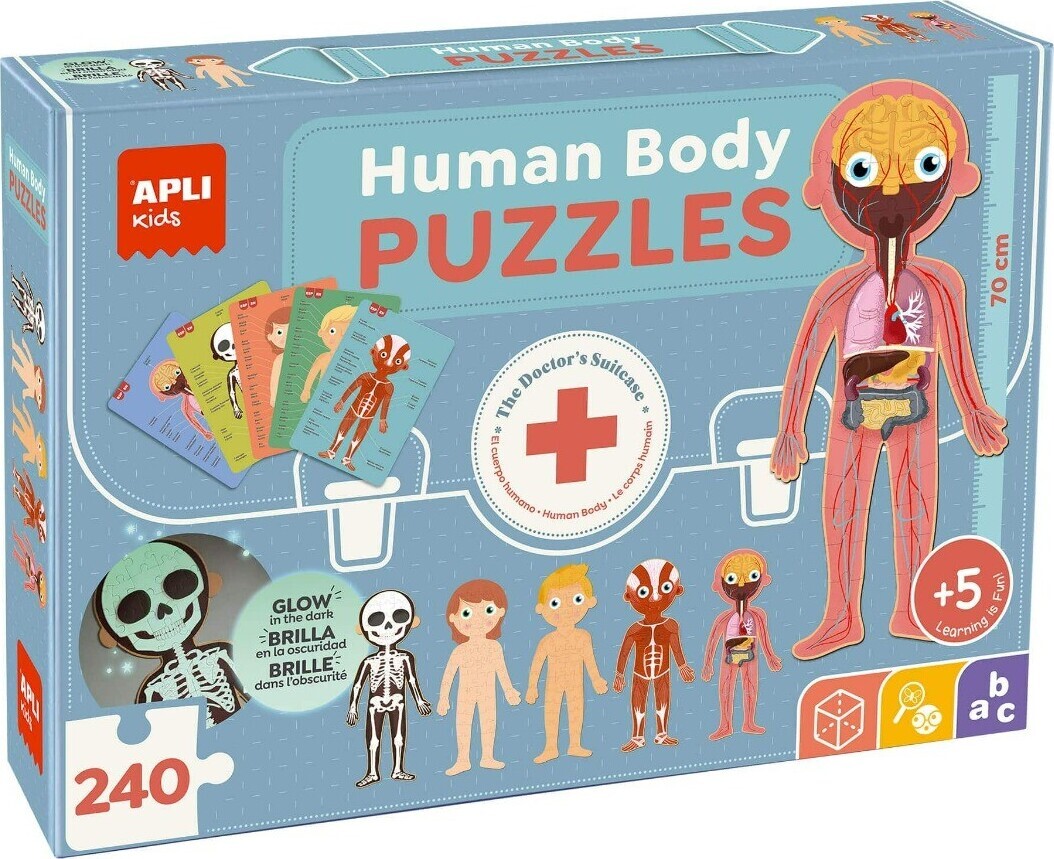 Ši žaisminga edukacinė dėlionė yra puiki priemonė mažiems tyrinėtojams pažinti žmogaus kūną - skeletą, organus ir raumenis. Sudaryta iš 240 detalių, ši dėlionė leis jūsų vaikui sukurti ne vieną, o net 5 žmogaus kūno formos dėliones. Kiekviena baigta dėlionė siekia 70 cm aukštį, suteikdama daugiau detalumo. O kad būtų dar įdomiau, skeleto formos dėlionės detalės šviečia tamsoje.