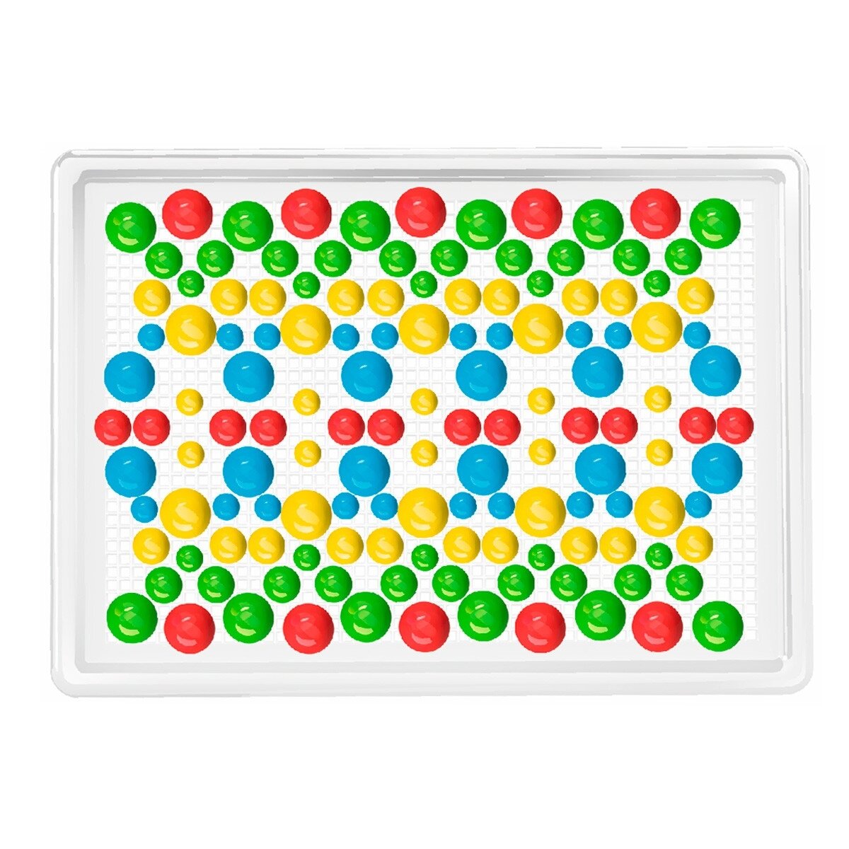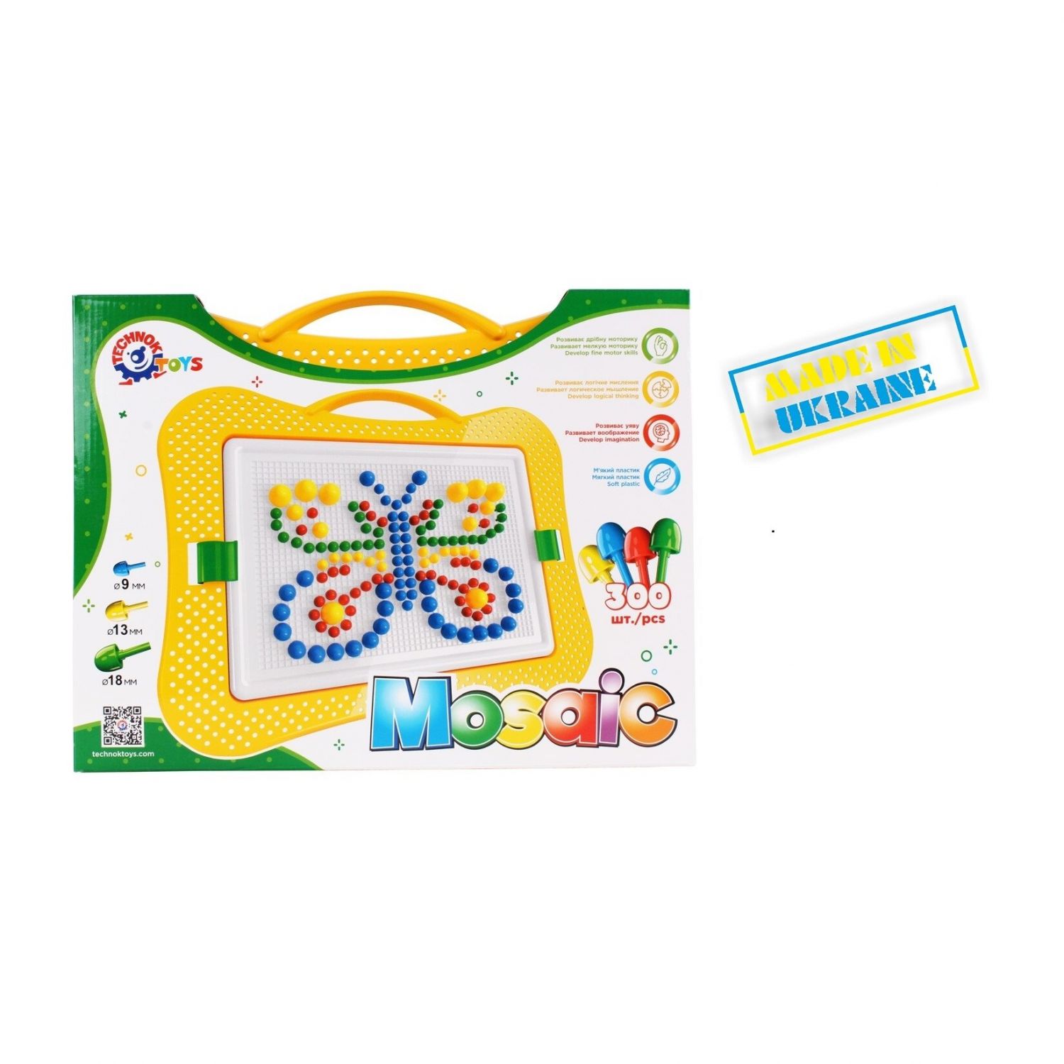 Mosaiką sudaro patogus dėklas su dviem spaustukais. 3 dydžių detalės 9 mm, 13 mm ir 18 mm. Iš viso 300 detalių.