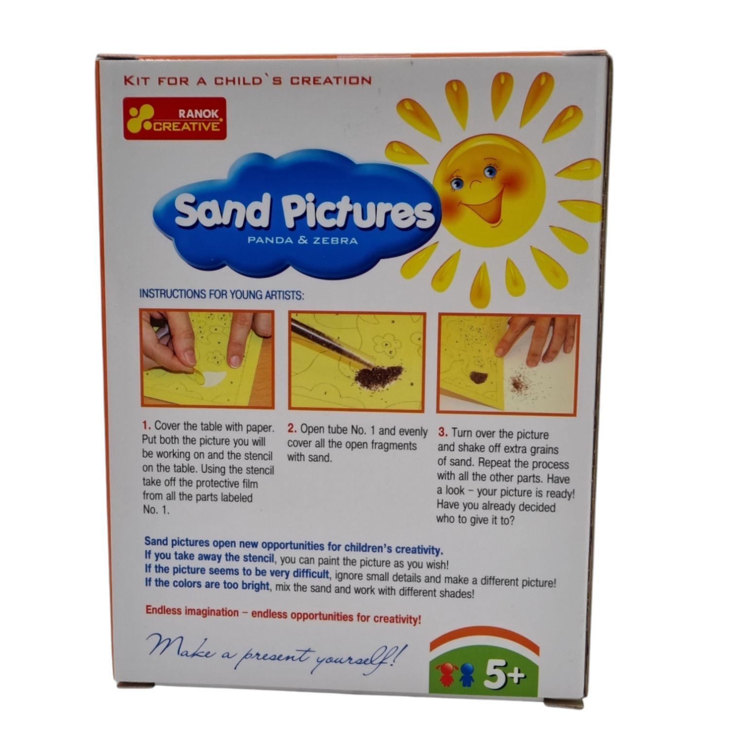 Fantastiškas laisvalaikis labai mažiems vaikams. Kartu su tėveliais ar seneliais vaikas gali padaryti tikrą smėlio paveikslą. Tai labai lengva, bet žavinga! Ryškiaspalvis smėlis ir blizgučiai sukurs pasakišką atmosferą jums ir jūsų vaikui, o jūs puikiai praleisite laiką kartu!