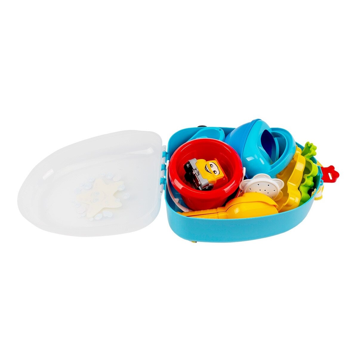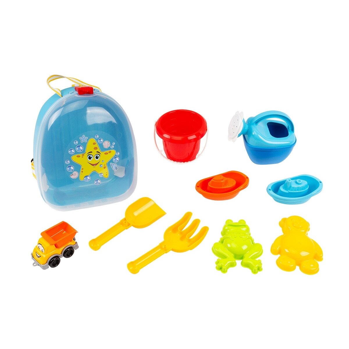 Rinkinyje rasite kompaktišką kibirėlį, kuris puikiai tinka smėlio rinkimui ir didelių bokštų statymui. Mažas grėbliukas ir kastuvas taps nepakeičiamais įrankiais smėlio pilies statymui, o gyvūnų formos formelės leis vaikui lengvai sukurti žavias smėlio skulptūras. Laistytuvas ne tik padės sudrėkinti smėlį, kad jis būtų tinkamesnis statybai, bet ir taps naudingas sode ar ūkyje. Be to, rinkinyje yra dvi valtys ir mini savivartis, su kuriais jūsų vaikas galės fantazuoti apie jūrų nuotykius ar statybų darbus, imituodamas tikras transporto priemones.