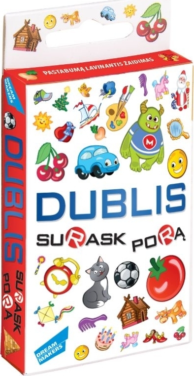 Mini stalo žaidimas DUBLIS - yra linksmas ir aktyvus žaidimas, ugdantis pastabumą ir reakciją. Žaidimo tikslas – pirmam surasti vienodus daiktus, pavaizduotus skirtingose kortelėse. Laimėtoju taps tas, kas pasirodys greičiausias ir pastabiausias ir surinks daugiausia kortelių. Žaidimo tikslas - pirmam surasti tokius pačius paveiksliukus skirtingose kortelėse Žaidėjų skaičius: nuo 2 iki 4.