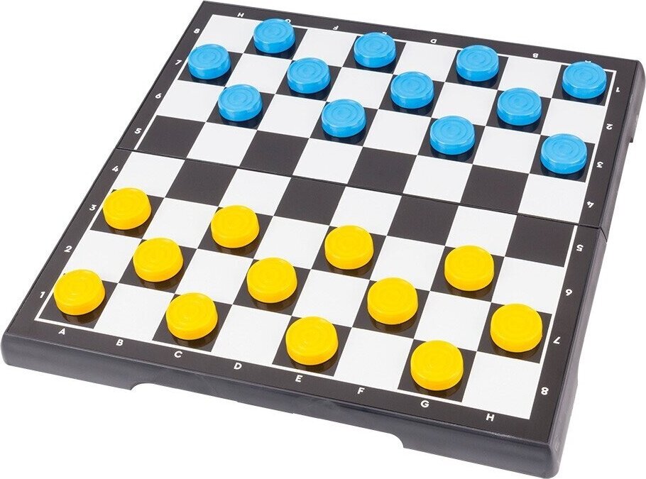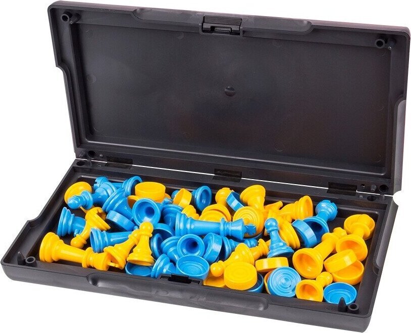 Figūros didelės ir patogios, klasikinio dizaino, mėlynos ir geltonos spalvos. Figūros „karalius“ aukštis – 65 mm, „pėstininkas“ – 35 mm. Šaškių skersmuo yra 25 mm.
