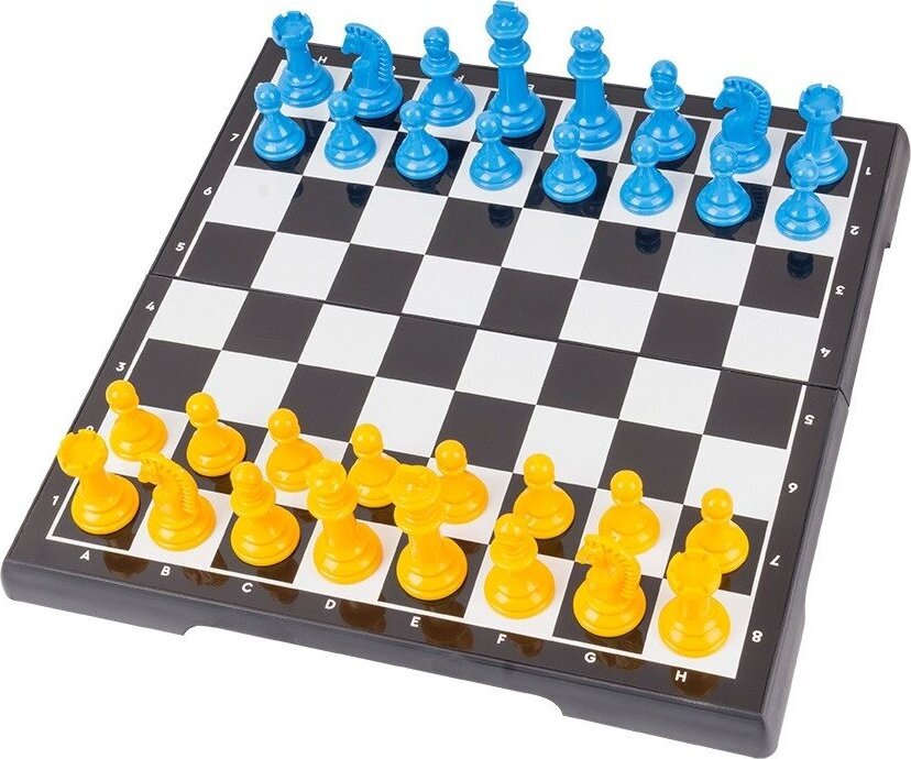 Pilna komplektacija: plastikinė dėžė su metaline lenta, šachmatai - 32 figūrėlės, šaškės - 24 vnt.