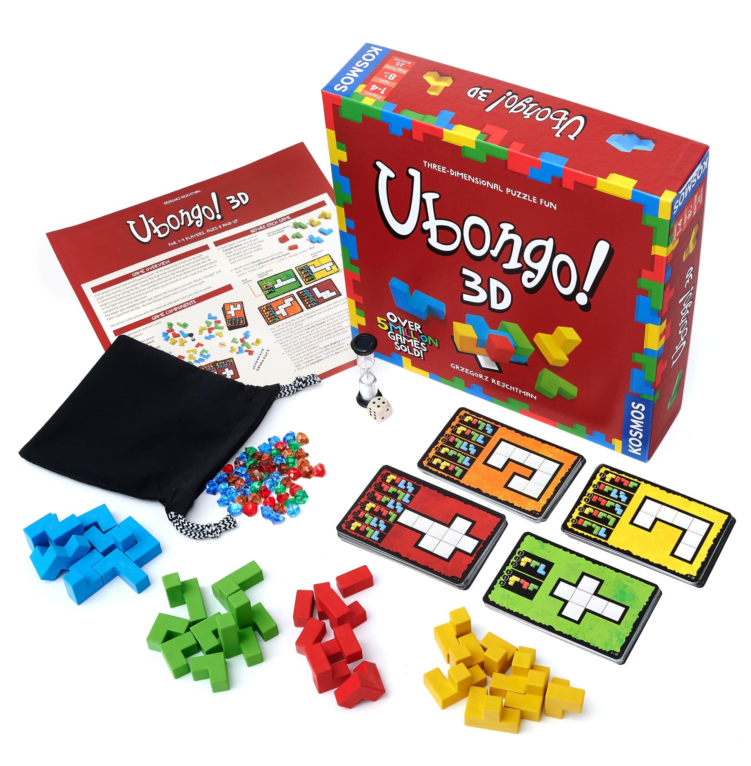 Kiekviena galvosūkio kortelė turi skirtingus galvosūkiu abiejose pusėse: vienoje lengvesnis, kitoje sudėtingesnis. Iš viso yra keturi skirtingi sudėtingumo lygiai, taip suteikiant galimybę žaisti visai šeima arba skirtingo amžiaus žaidėjams. Žaidimą sudaro keturi figūrėlių rinkiniai, 72 dvipusės kortelės, kuriose yra net 671 galvosūkis. Ubongo 3D yra tinkamas žaisti ir vienam žaidėjui. Meskite sau iššūkį ir kuo greičiau išspręskite šį spalvotą, pasaulinio populiarumo sulaukusio stalo žaidimo galvosūkius.