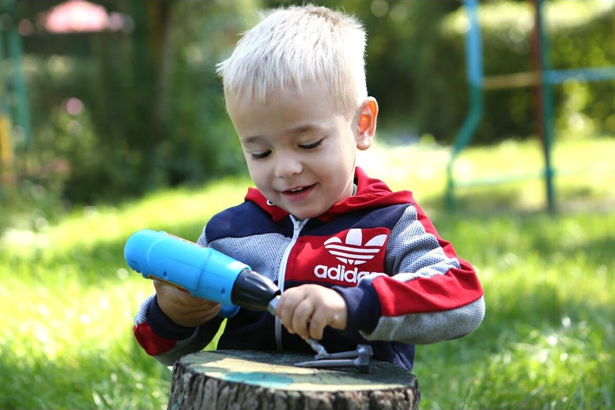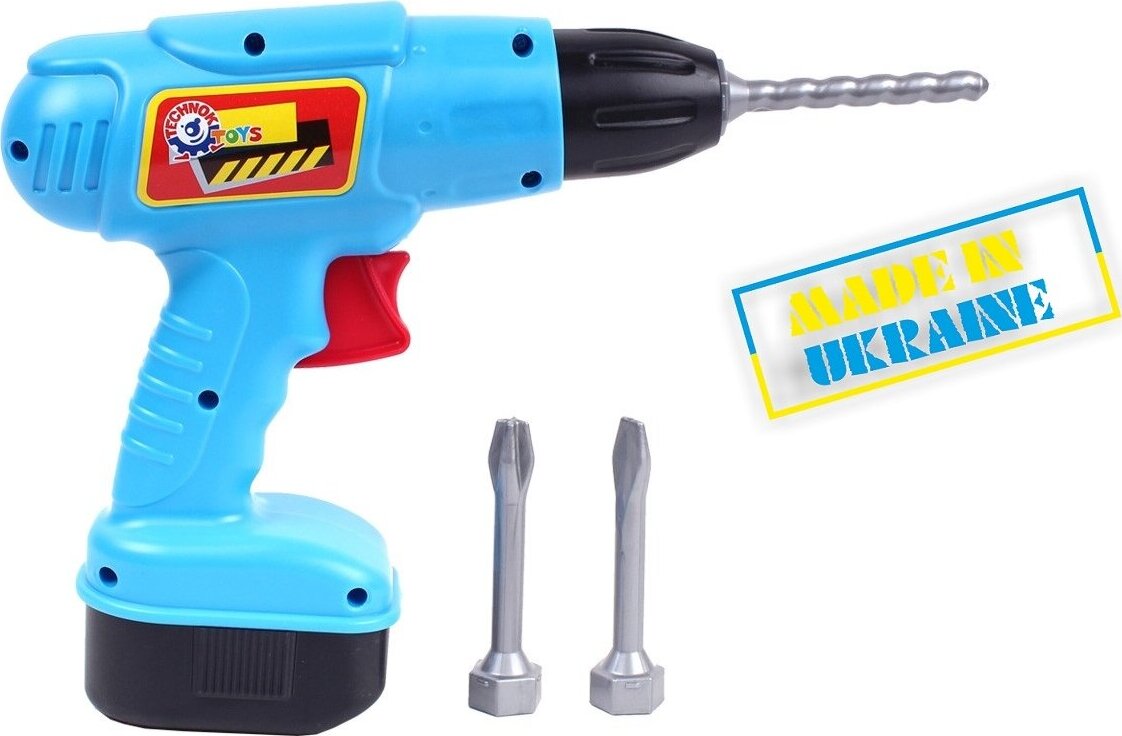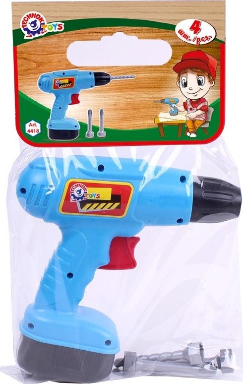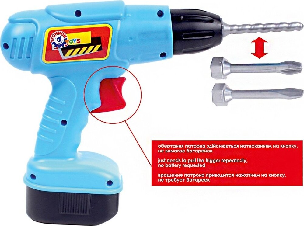 Veikia be baterijų. Vaikas pats gali sukti grąžtą.