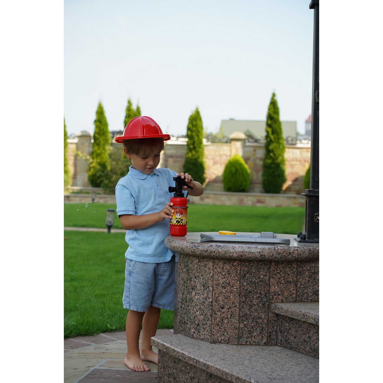 O dabar apie įdomiausią komplekto prekę - žaislinį gesintuvą su veikiančiu vandens antgaliu! Tai ne tik žaislas, tai tikras įrankis, su kuriuo jūsų vaikas gali kovoti su įsivaizduojamomis liepsnomis ir išgelbėti „aukas“. Į gesintuvą galima pripildyti vandens ir „gesinti“ įsivaizduojamus gaisrus.