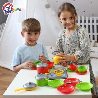 Šis ryškiaspalvis virtuvės komplektas su gausybe įvairių stalo įrankių ir indų tikrai sužavės tiek vaikus, tiek jų tėvelius. Rinkinys suteikia viską, ko reikia gardiems patiekalams paruošti ar svetingai priimti svečius. Čia rasite puodus su dangčiais, keptuvę ir viryklės paviršių – mažasis virtuvės šefas galės kurti savo kulinarinius stebuklus!