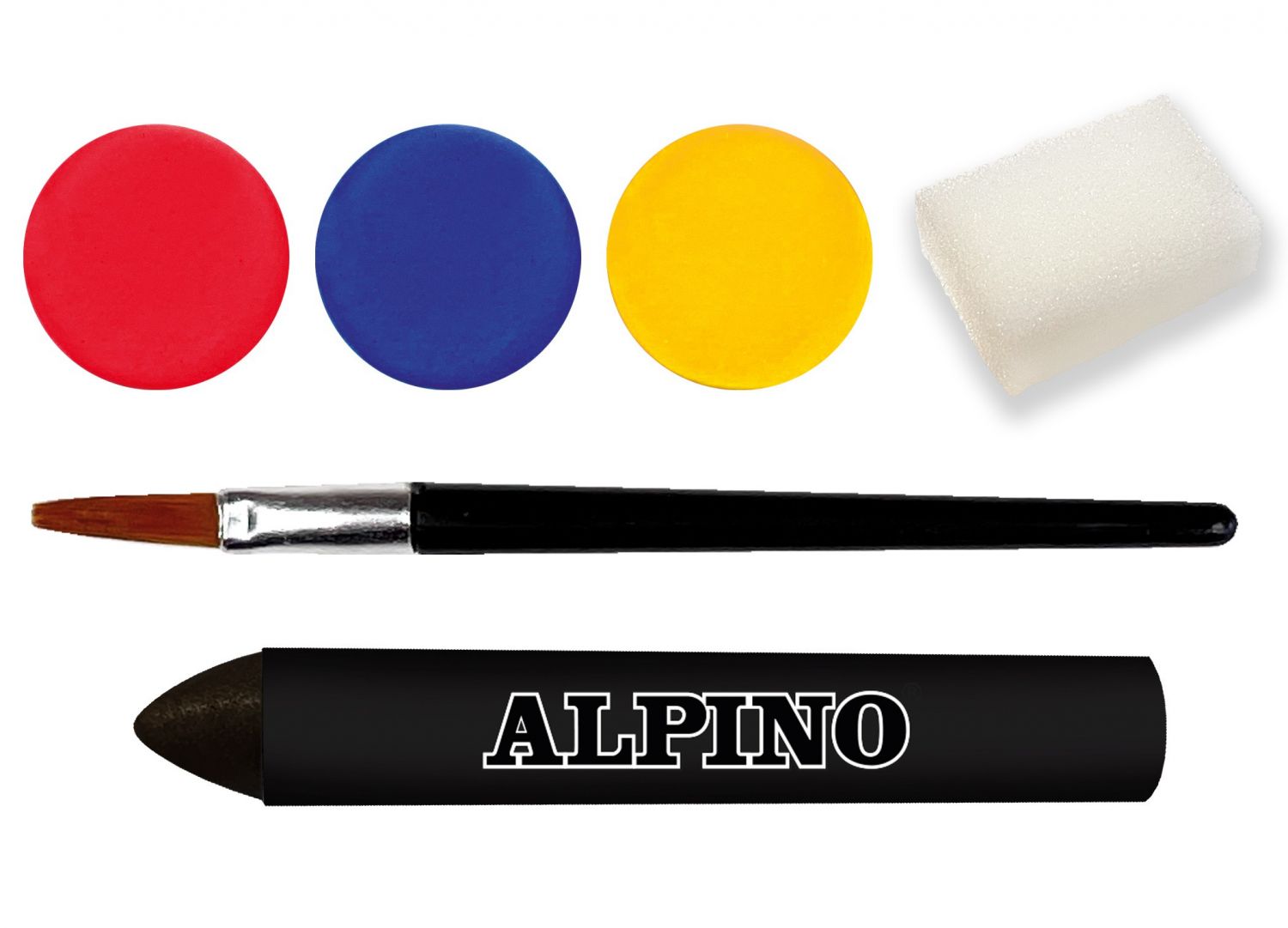 - Rinkinį sudaro 3 spalvos (mėlyna, geltona, raudona) 1 teptukas, kempinėlė ir juodos spalvos kreidelė grimui kontūruoti.