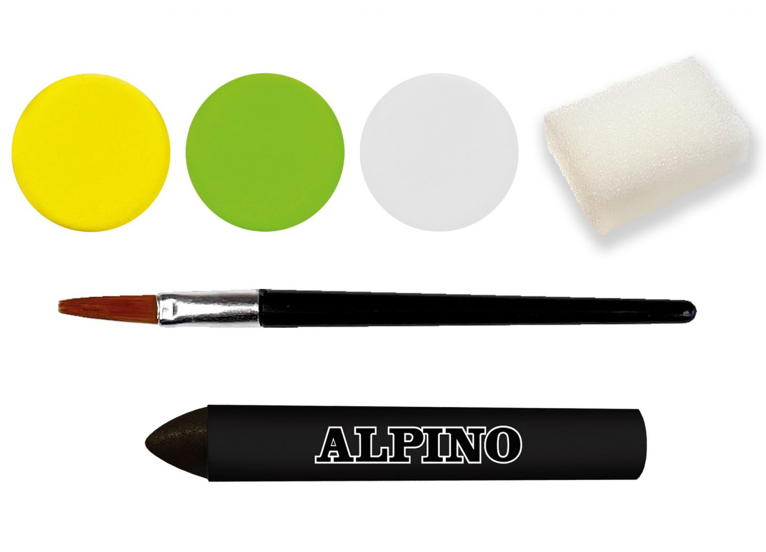 - Rinkinį sudaro 3 spalvos, (balta, geltona, žalia), 1 teptukas, kempinėlė ir juodos spalvos kreidelė grimui kontūruoti.